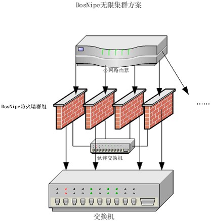 用多台DosNipe防火墙来共同承担大流量攻击所有带来的高负载。