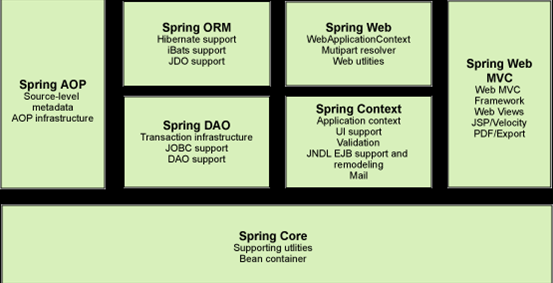 组成Spring 框架的每个模块(或组件)都可以单独存在,或者与其他一个或多个模块联合实现。每个模块的功能如下: